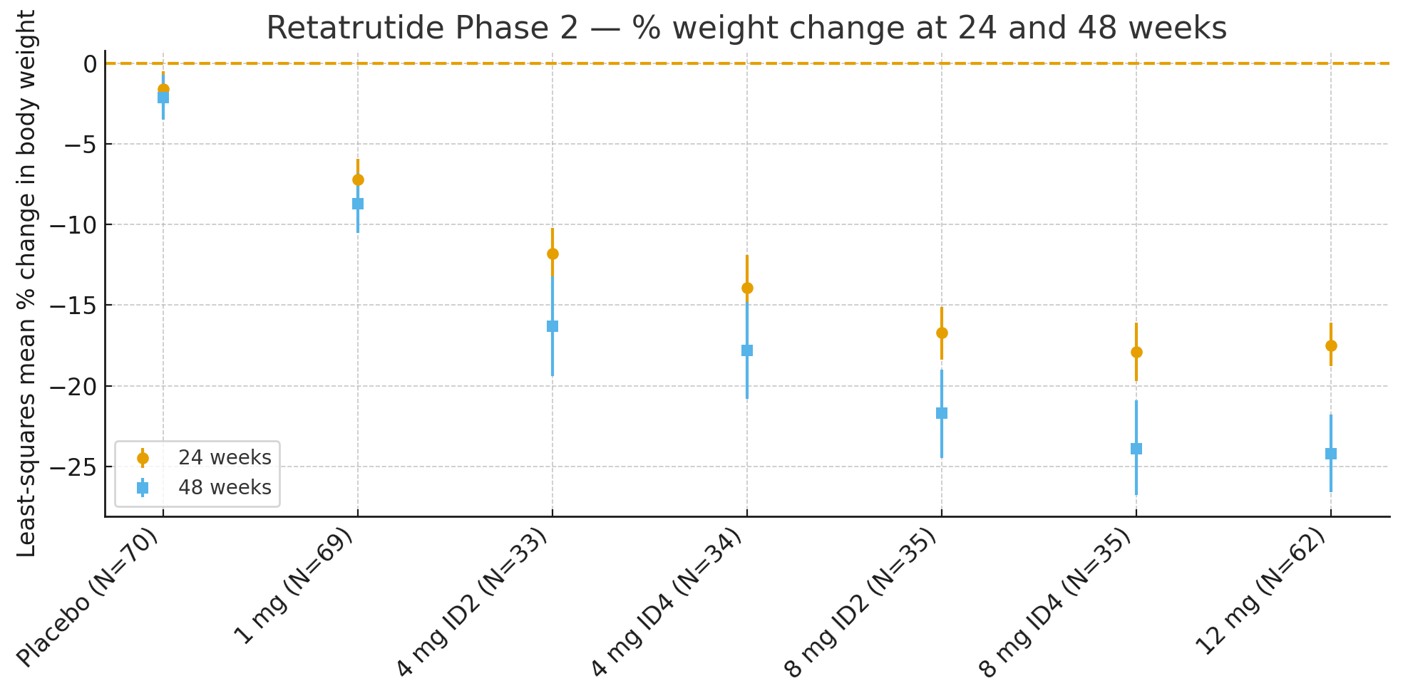 Retatrutide (LY3437943) بولسا ئاكتىپلاشتۇرۇلغان رومان يەككە پېپتىد دورىسىبىرلا ۋاقىتتا ئۈچ قوبۇللىغۇچ: GIP ، GLP-1 ۋە گلۇكاگون. سېمىزلىك كېسىلىگە گىرىپتار بولغان ، ئەمما دىئابىت كېسىلى بولمىغان كىشىلەرنىڭ ئۈنۈمى ۋە بىخەتەرلىكىنى باھالاش ئۈچۈن ، 2-باسقۇچلۇق ، ئىختىيارى ، قوش قارىغۇ ، ئورۇن بەلگىلەش ئارقىلىق كونترول قىلىنغان سىناق ئېلىپ بېرىلدى (NCT04881760). جەمئىي338 قاتناشقۇچىBMI ≥30 ياكى ئەڭ ئاز دېگەندە بىر ئېغىرلىق بىلەن مۇناسىۋەتلىك ئەگەشمە كېسەللىكلەر بار ، ئىختىيارىي ھالدا ئورۇن بەلگىلەش ياكى قايتا تەكشۈرۈش دورىسى (1 مىللىگىرام ، ئىككى ئۇنۋان جەدۋىلى بىلەن 4 مىللىگىرام ، ئىككى ئۇنۋان جەدۋىلى بىلەن 8 مىللىگىرام ياكى 12 مىللىگىرام) ھەر ھەپتىدە بىر قېتىم تېرە ئاستى ئوكۇلى ئارقىلىق 48 ھەپتە ئىشلىتىلىدۇ. Theدەسلەپكى ئاخىرقى نۇقتا24 ھەپتە ئىچىدە بەدەن ئېغىرلىقىنىڭ پىرسەنت ئۆزگىرىشى بولۇپ ، ئىككىلەمچى نۇقتىلار 48 ھەپتە ئىچىدە ئېغىرلىقنىڭ ئۆزگىرىشى ۋە تۈرگە ئايرىپ ئورۇقلاش بوسۇغىسىنى ئۆز ئىچىگە ئالىدۇ (% 5 ،% 10 ،% 15 ،% 15).